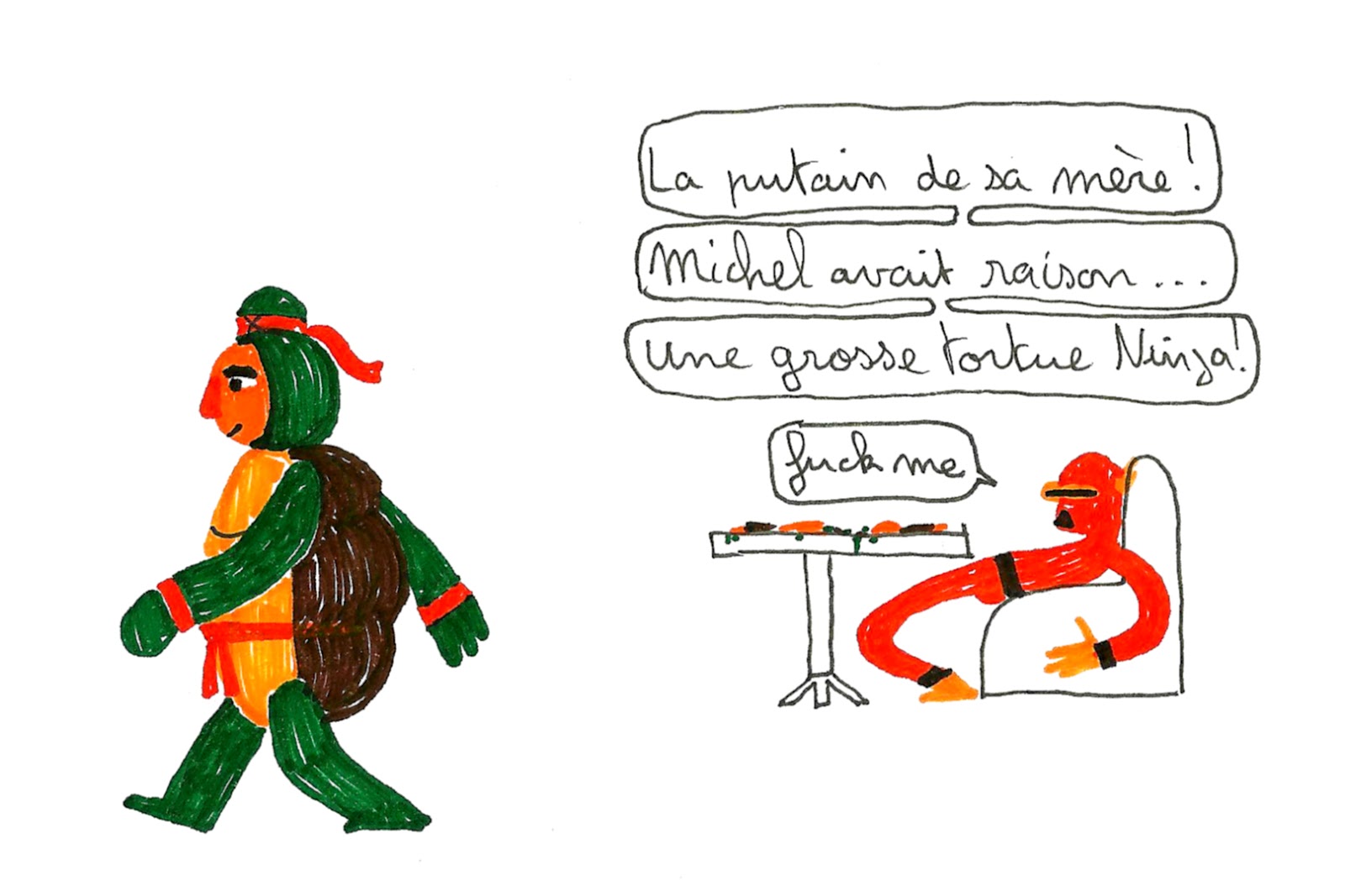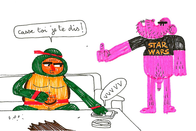 Genre que la tortue se prenne des gros claques de b**** de tous les côtés entre Dada et le Star Sarce (frère de la serveuse). En tout cas c'est énorme. J'adhère, j'adore. Pond-nous une version Papier lorsque le projet sera terminé !